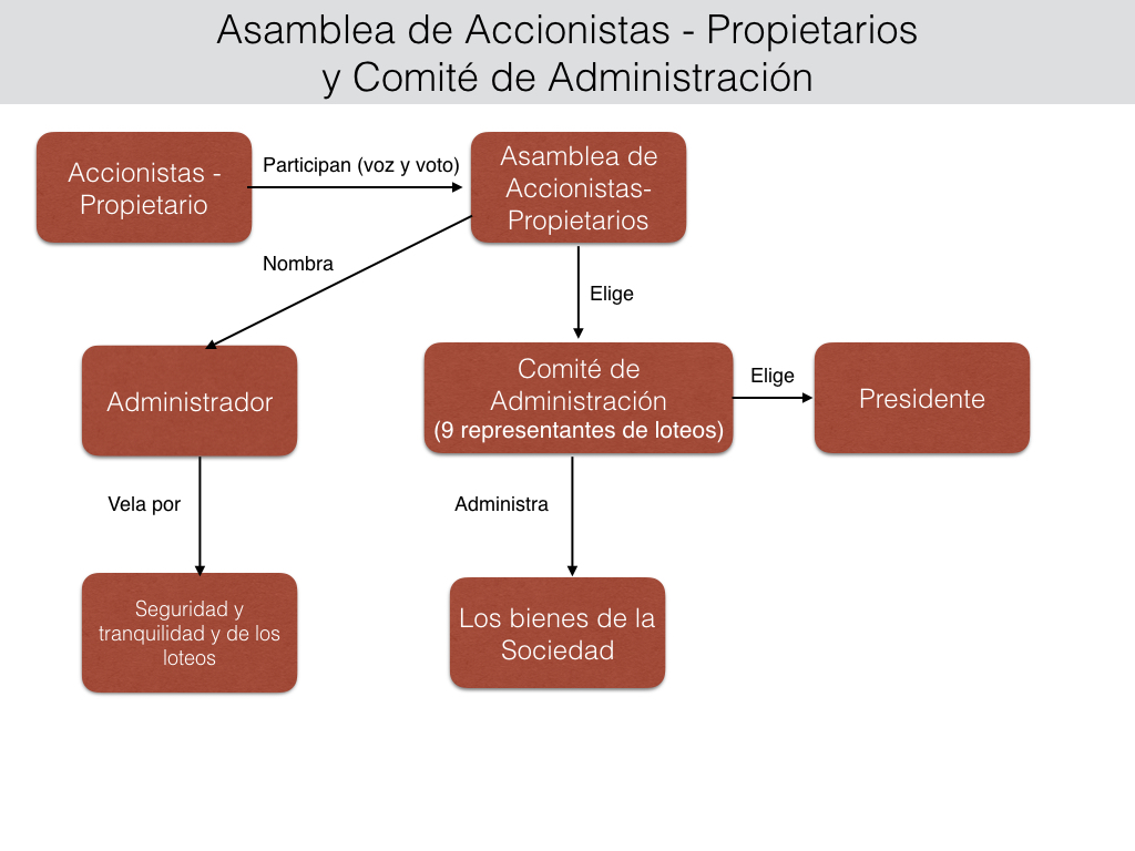 Los temas referentes al uso y administración de los bienes comunes serán resueltos en Asambleas integradas por todos los propietarios-accionistas de los loteos Fundo Loreto y la administración de éstos se realizará por un Comité de Administración de 9 miembros, elegidos por la Asamblea, durarán en sus cargos tres años y pueden ser relegidos indefinidamente. El Comité de administración será presidido por el miembro que designe la asamblea, o en subsidio, el propio comité.